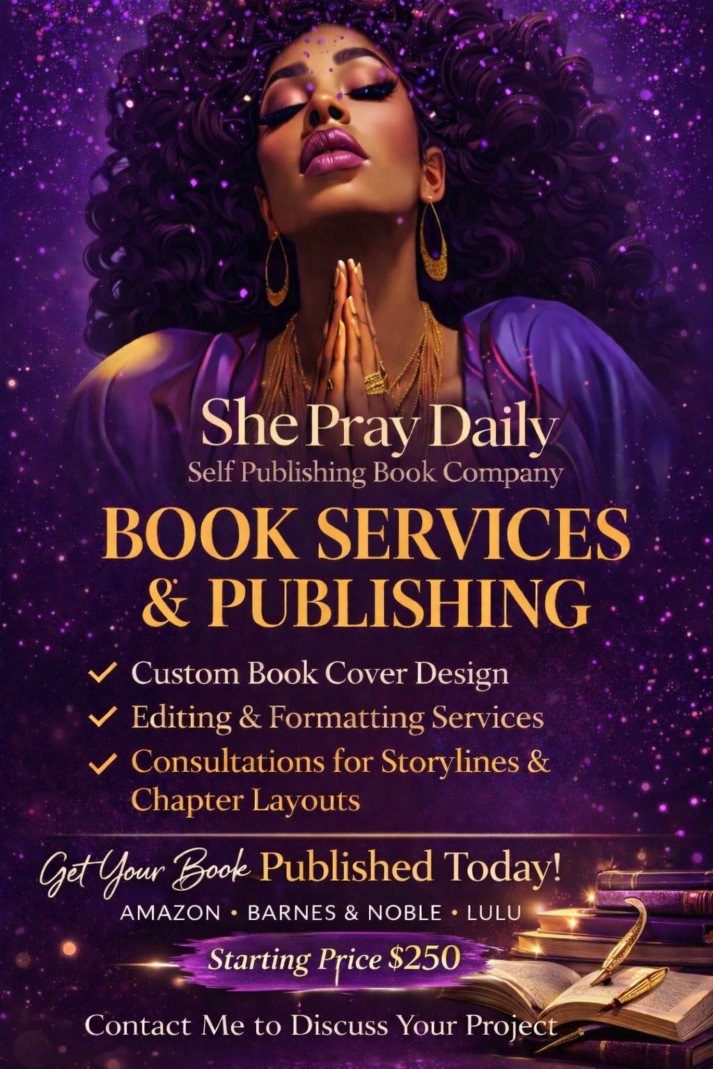 Welcome to She Pray Daily Self-Publishing, where we bring stories of inspiration and faith to life on paper. Our mission is to empower future authors by providing a comprehensive suite of services tailored to meet the unique needs of each storyteller. We believe that every story matters and deserves to be told with passion and precision.
